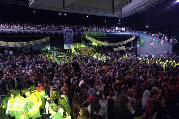 هۆڵەکە بە پۆستەری ڕێبەر ئاپۆ، پانکارت و ئاڵا جیاواز ڕازێنرایەوە و پانکارت بە نوسینی 'ڕێبەرێتی ئازاد، کۆمەڵگەی دیموکراتیک' و 'نەورۆز پیرۆز بێت' لەسەر سەکۆ شەکێنرایەوە.