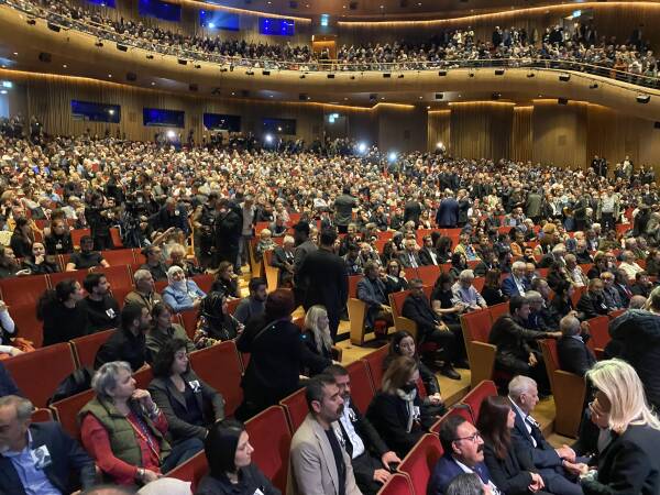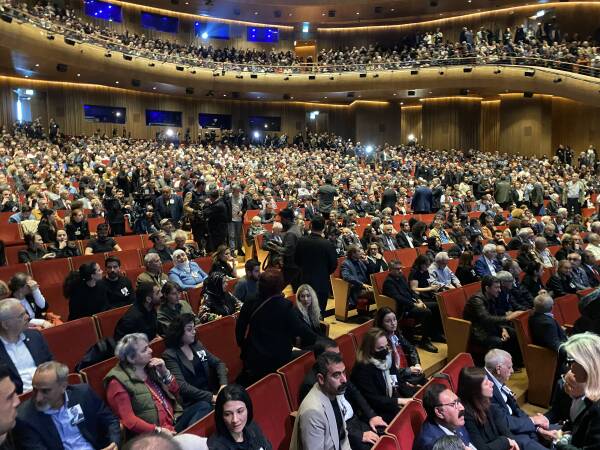 لە هۆڵەکەدا دروشمەکانی 'شەهید نامرن'، 'پەیام هێنەری ئاشتی لە ئیمرالییەوە'، 'بژی برایەتی گەلان' و 'بەڵێنت پێدەدەین سری ئاشتی بەدی بێنین' بەردەوام دەوترێنەوە.