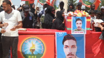 دەیان خەڵکی حەسەکە و ئەندامانی ڕێکخراوە مەدەنییەکان بەشداربوون لە بەخاکسپاردنی تەرمی شەڕڤانی قەسەدە شەهید محەمەد حاجی سەعید کە ٣٠ ی ئایار لەسەر ئەرکەکەی شەهید بوو.